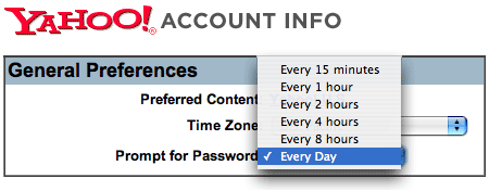 I went to my Account Settings page on Yahoo to see if perhaps a preference got flipped, and to my delight I saw a panel which let me set the frequency of login prompts. Great! Upon visiting the panel, however, this is what I saw: