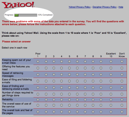 This is really bad practice, Yahoo. You have presented a survey that will not only receive much less participation than it should, but the data you *do* get will not even be representative of your user base. The only people who will fill this out are people who are extremely patient, extremely concerned about you, and in possession of a lot of free time. Is that really representative of your user base? Cut this thing down to one page and you’ll learn a lot more.