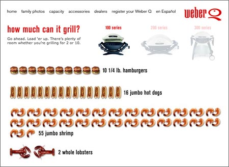 Now that is some great information design. I don’t care if the grill is X inches by Y inches. I don’t care if it’s “small”, “medium”, or “large”. I just care what I can grill on it. Weber’s diagram tells me I can cook 10 hamburgers, 16 hot dogs, 55 shrimp, or 2 lobsters on it, and that’s all I need in order to determine that the 100 Series is big enough for me (I ended up getting the 120… it has flaps).