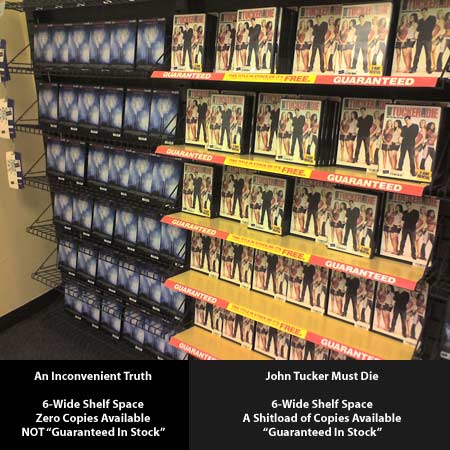 What’s that? Two identical shelves, both 6-wide and 6-tall. On the left is Al Gore’s popular new documentary “An Inconvenient Truth”. On the right is a movie I’ve never even heard of called “John Tucker Must Die”. There are at least 40 copies of the obscure Tucker thing available and exactly ZERO copies of An Inconvenient Truth. And guess which one is “Guaranteed In Stock!”? Tucker, baby!