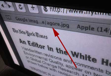 So tonight, I was watching Al Gore’s “An Inconvenient Truth” on DVD and about halfway through the movie, they cut to a scene of Gore typing on his Powerbook. For a split second they showed his web browser and I hit pause and snapped this picture: