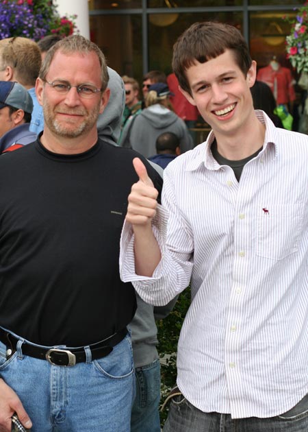 Upon dropping him off at the University Village Apple Store, I parked for a few minutes and said hi to the Blue Flavor homies who had been there since 7am and the 43 Things guys who were right behind Rob in line. Tom and Brian ended up getting their picture on the front page of the Seattle Times and a blurb in an AP story too… nice.