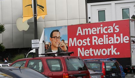 Pathetically, Verizon hired an advertising truck to drive back and forth around the Apple Store for an hour or so as well (pictured below). I’m not sure what the thought there was, and I can’t think of a worse audience to try and sell your service to than a crowd of people willing to walk barefoot and blindfolded into the treacherous arms of AT&T.