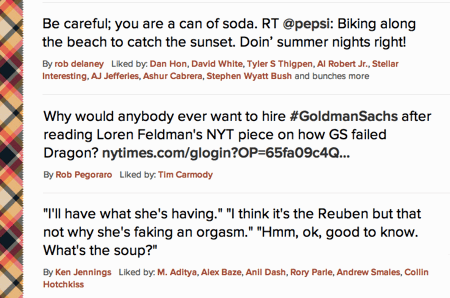 The first tweet is Rob Delaney making sure a can of Pepsi gets home safe. I don’t follow Rob so I would have normally missed this tweet. However, since I follow some people who faved it, I now see it in my Twitter stream.