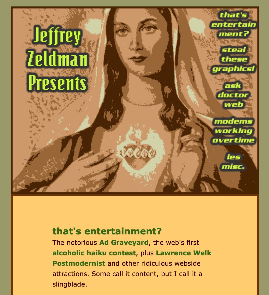 Here is the first version of Zeldman.com I could find, from 1998. Amazing for the era, and holds up impressively in a nostalgic, cyber-Americana sort of way, but you can see how limited we were by screen widths, color palettes, and layout technologies.